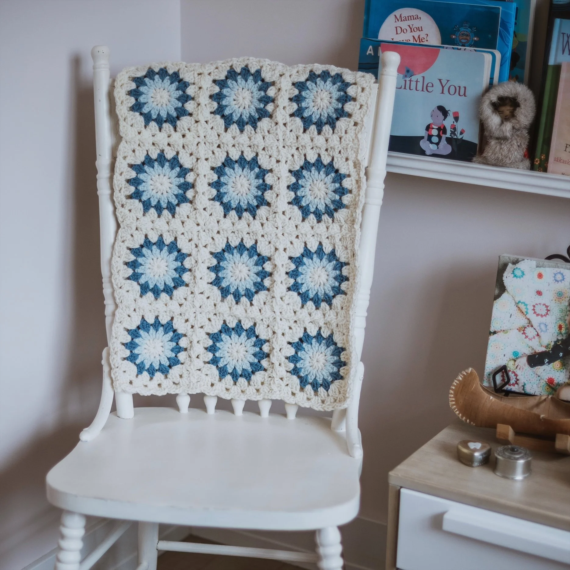 Crocheted baby blanket with starburst pattern in blues, trimmed in off-white.